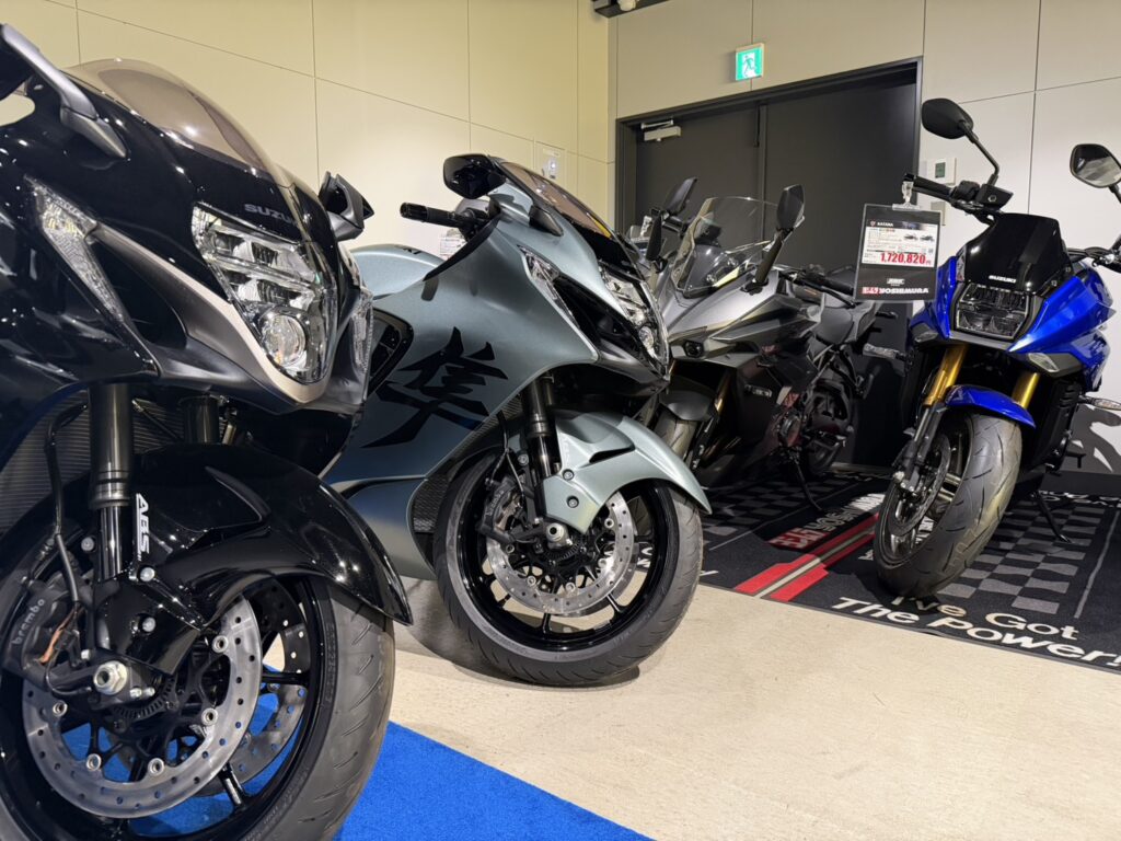 店内や屋外展示場には最新のスズキバイクを多数展示しており、実際の車両をご覧いただきながら、スタッフが丁寧にバイク選びをサポートいたします。