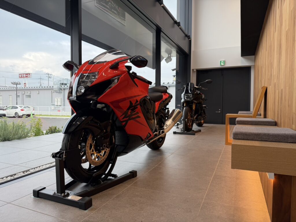店内や屋外展示場には最新のスズキバイクを多数展示しており、実際の車両をご覧いただきながら、スタッフが丁寧にバイク選びをサポートいたします。
