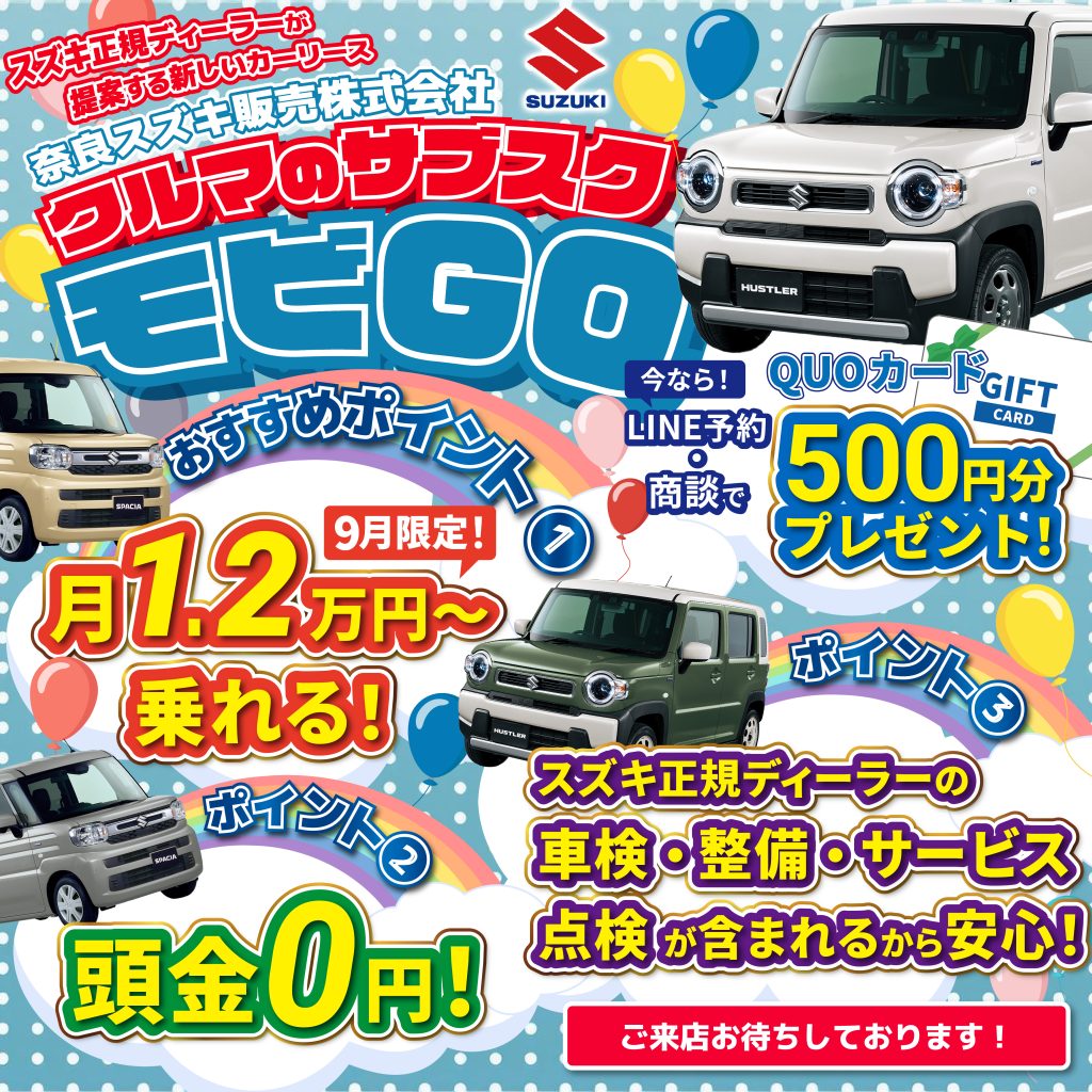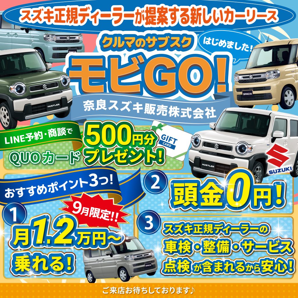 スズキ正規ディーラーが提案する新しいカーリース【モビGO🚗】★9月はお得に始めるチャンス★