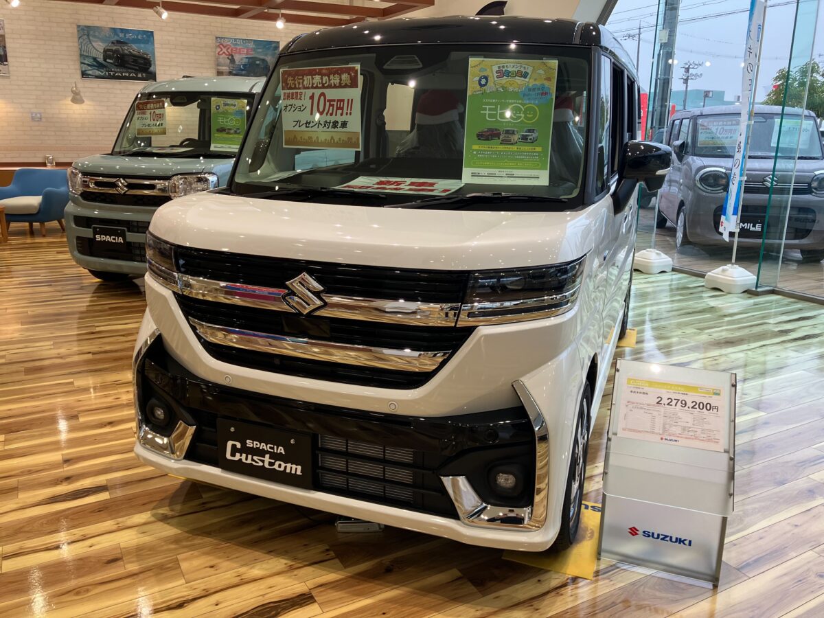 ショールームに入った瞬間、まず目に入るのがこの存在感たっぷりのスペーシアカスタム🚗✨